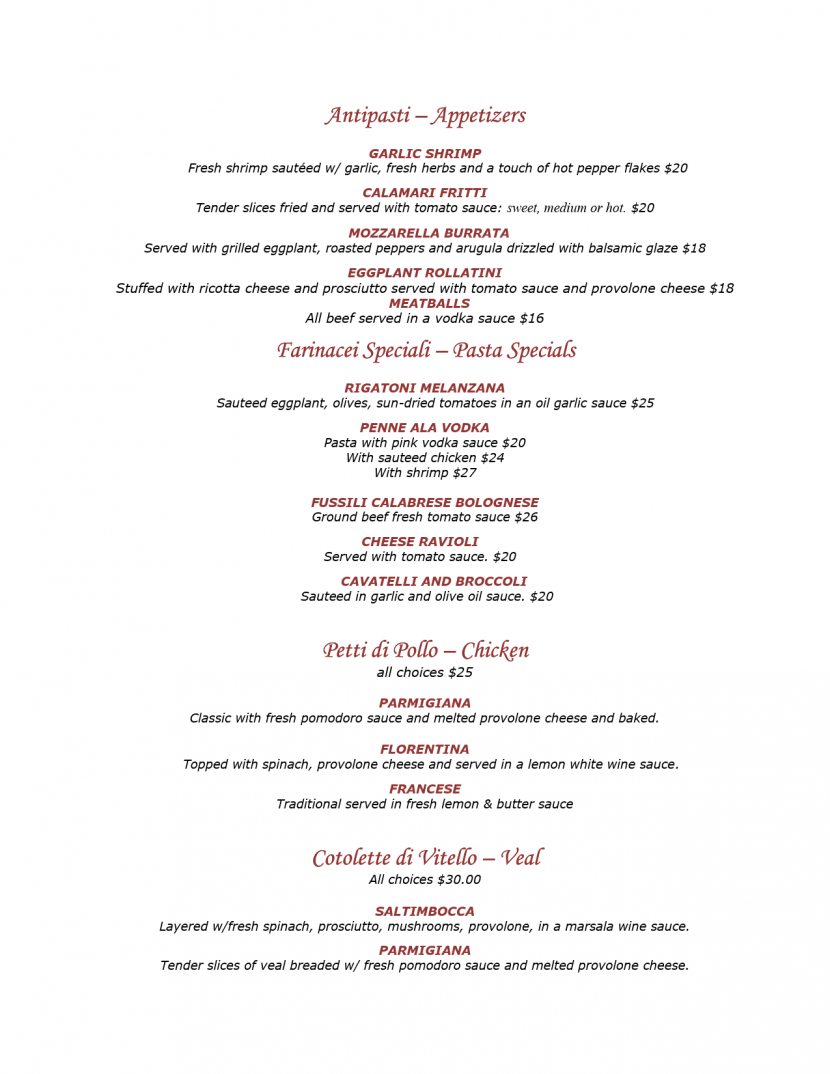 soups. Well prepared entrees include pasta, veal, chicken,